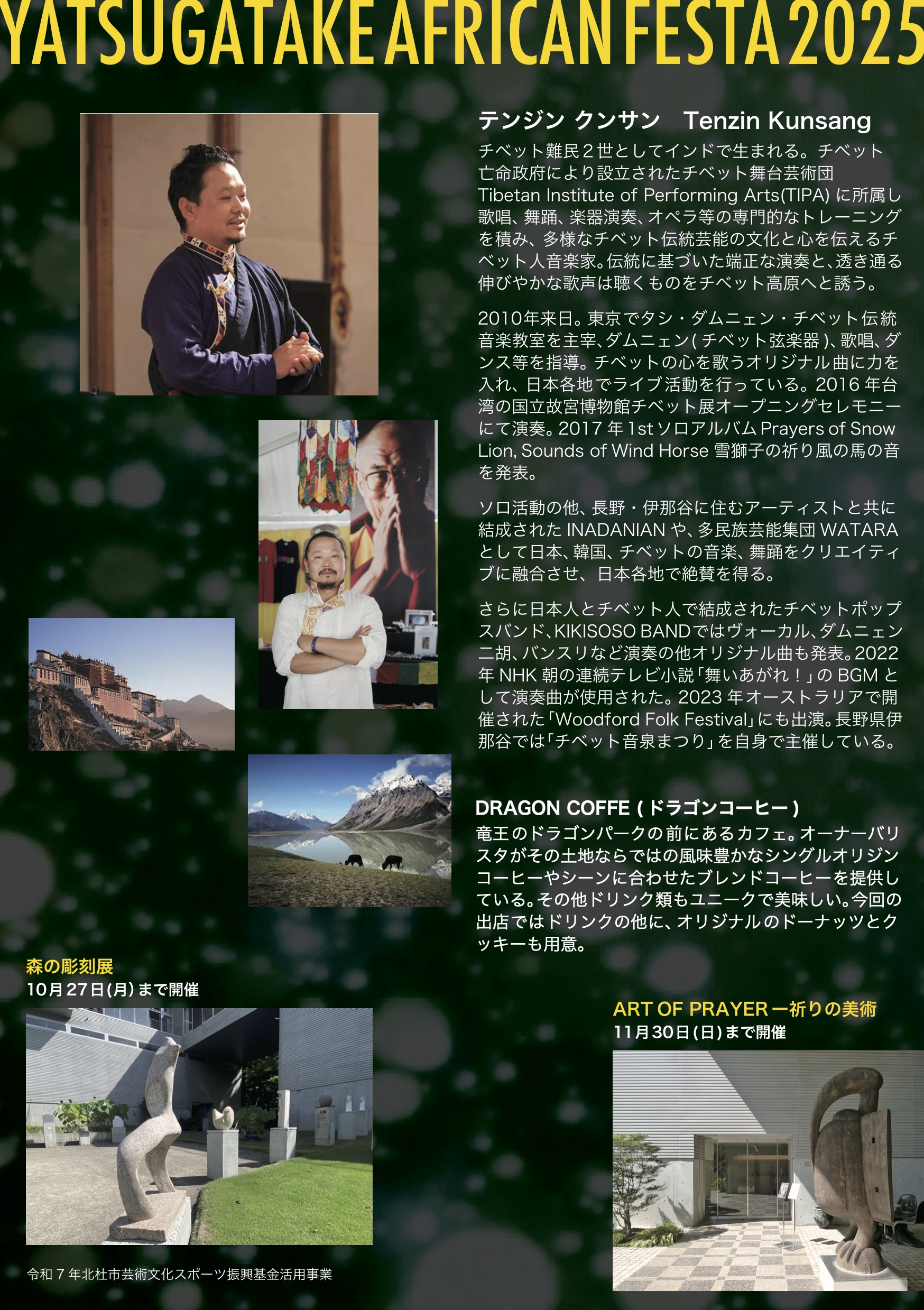 多様なチベット伝統芸能の文化と心を伝えるチベット人アーティスト・テンジン クンサンのライブです。 伝統に基づいた端正な演奏と、透き通る伸びやかな歌声は聴くものをチベット高原へといざないます。 会場は当館企画展「祈りの美術」の展示室で、作品に囲まれて開催します。当館中庭にて、「森の彫刻展」の作品とDRAGON COFFE (ドラゴンコーヒー)のドリンクやドーナツなども楽しめます。
